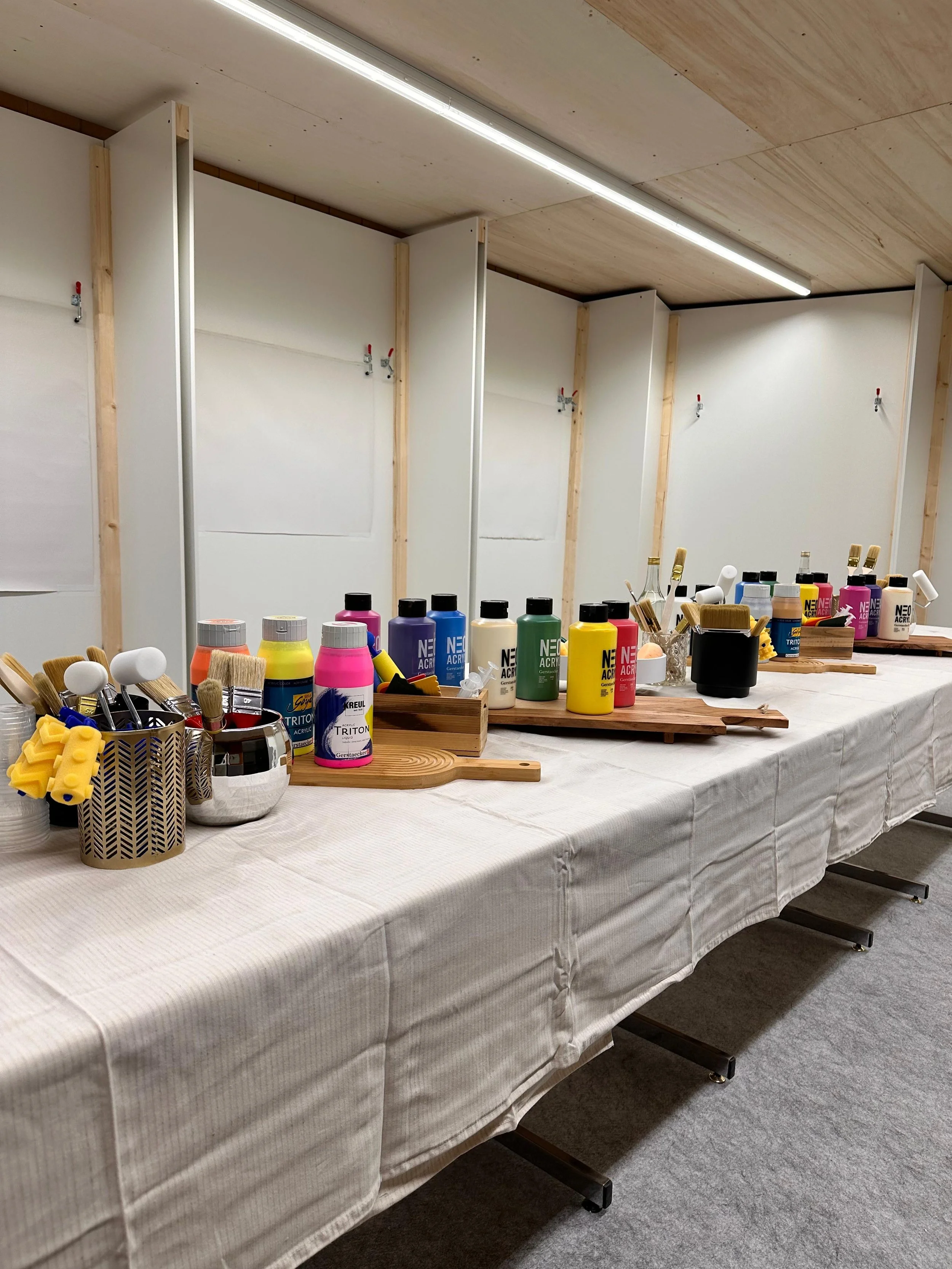 Begrüssung & Einführung: Kurze Einführung in Materialien, Farben und Ablauf – danach wählst du deine Leinwand und ziehst die Schutzkleidung an.